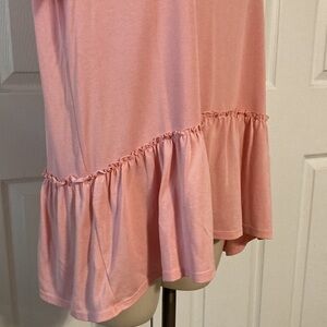 Lavender Field pink ruffled short sleeve top In size L. Soft fabric is modal and polyester blend. Front is shorter than the back. Please see photos for approximate measurements and details. Excellent pre-owned condition from smoke free and pet free home.