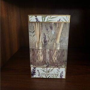 Elegant lavender reed diffuser set with a floral design. Perfect for adding a soothing aroma to any room.