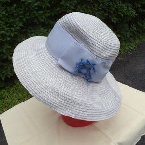Gently worn slightly faded lavender floppy hat with blue ribbon and hand stitched bows, B. Altman & Co. New York
