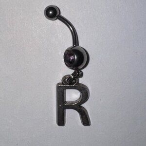 This belly ring has a Letter R and a Lavender gem on the belly ring.