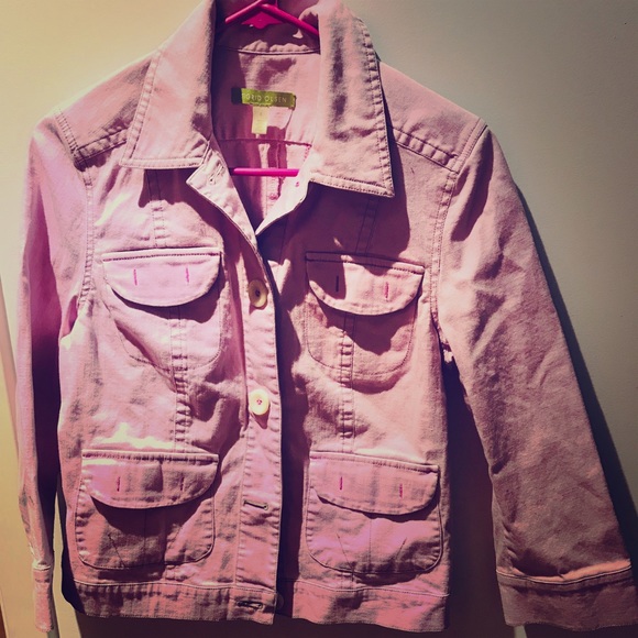 Khaki material... but the jacket is lavender. It has 4 pockets! Great for spring!