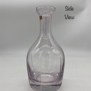 The Chroma Collection decanter-shaped lead crystal vase in lavender has etched lines ascending from the bottom of the vase to approximately midway, giving it a sleek, minimalist appearance. The light lavender coloring is a understated surprise, making this vase stand out among others. Please note there are some smudges on the inside of the glass, as seen in photos.