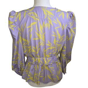 Lavender (light purple) wrap-style blouse featuring a prominent lime green leaf print. The blouse has a V-Neckline, puffed sleeves with elasticated cuffs and waist creating a peplum effect.