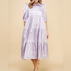 Step out in style with this elegant lavender dress featuring chic puff sleeves. Perfect for any occasion.