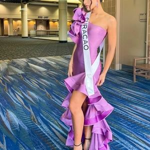 This dress is an absolute breathtaker 💜✨ A dazzling slip on gown with a one shoulder embellishment with a left slit at the bottom and ruffle details! As seen and featured on Miss Universe Curacao, this purple dream is a beauty! Valued at $85.