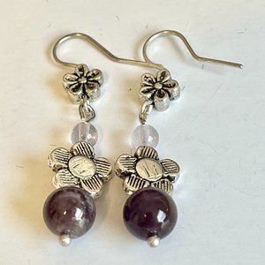 Lavender Purple Amethyst Bead Earrings Silver Plated Flower Dangle Semiprecious