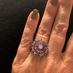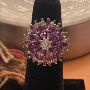 Lavender & CZ rhinestone ring. Size 5. This ring has the look of a large purple flower. The rhinestones shine making it a stunning piece. Sterling band.