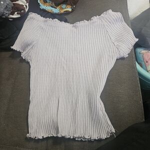 Light lavender ribbed short-sleeve top. Off-shoulder neckline with lettuce-edge trim. Soft stretch knit. Simple, feminine silhouette. Great for casual outfits.