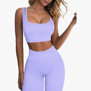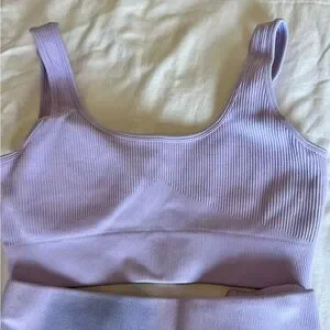 Stylish lavender ribbed two-piece set. Includes a crop top and high-waisted leggings. Perfect for casual outings or workouts.