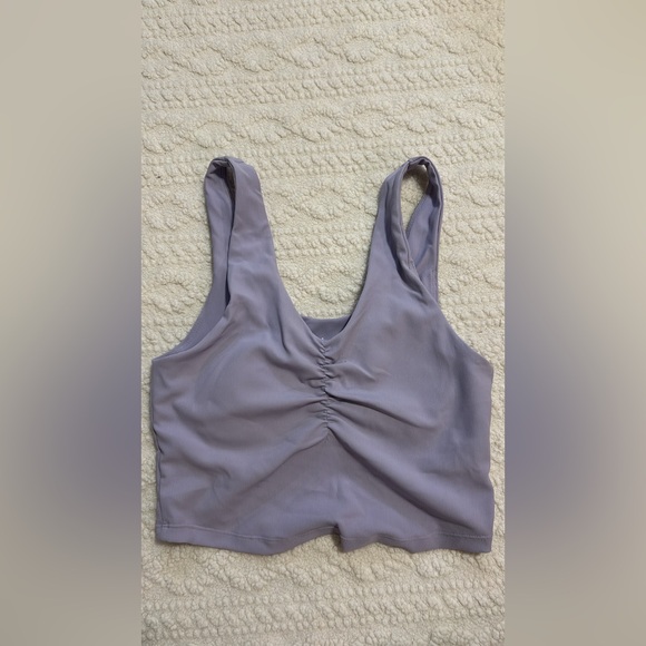 Stylish lavender tank top with ruched front. Perfect for casual wear.