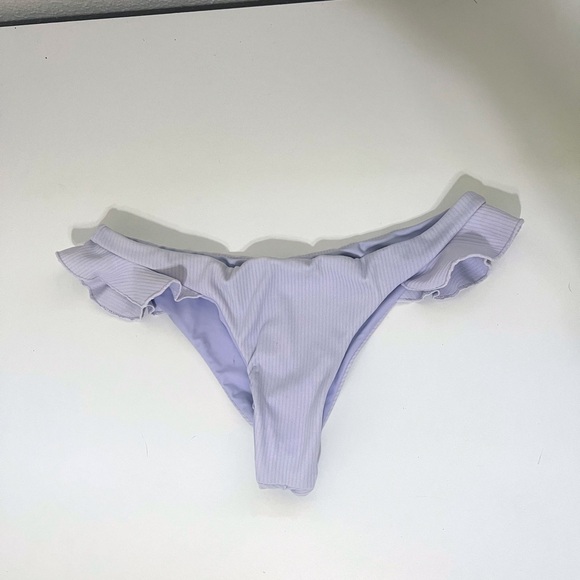 Chic lavender bikini bottom with playful ruffles. Perfect for a stylish beach day.