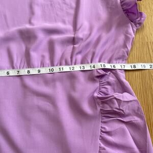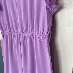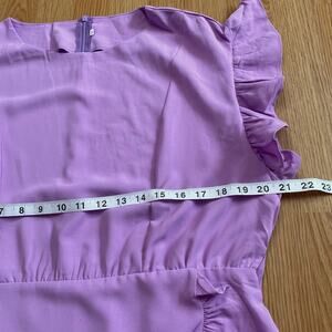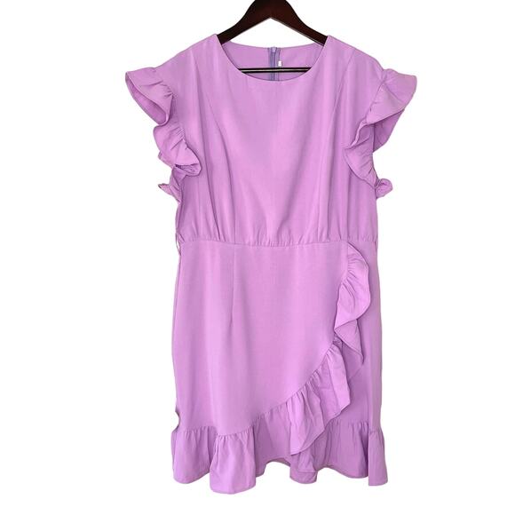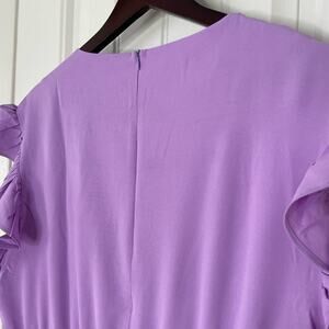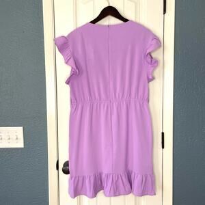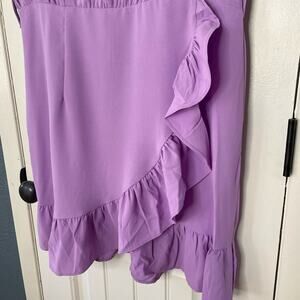 New without tags sleeveless lavender dress, size XL. Faux wrap skirt with ruffle along edge, as well as along sleeves. Crew neck, zip back, elastic waist. There are belt loops, but the belt is not with it.