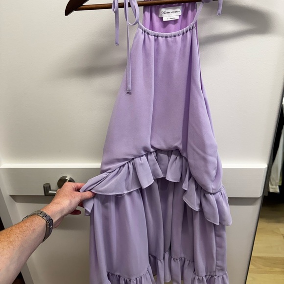 Elegant lavender halter dress with ruffle details. Small tearing on seam - not noticeable