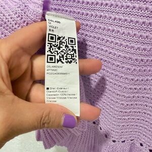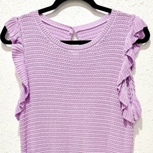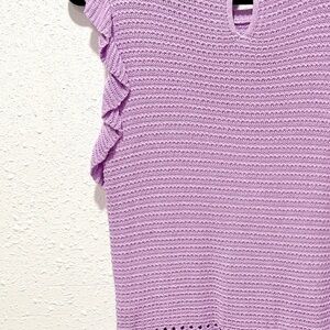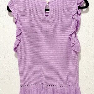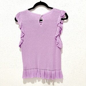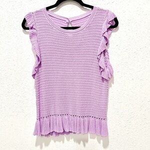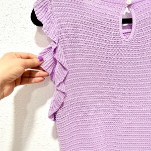 Purple sleeveless knit top features distinctive ruffles along the shoulder seams and a subtle eyelet-and-ruffle detail along the bottom hem. The knit is a textured, waffle, or cable-like pattern.