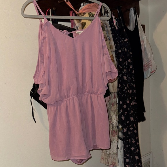 Chic lavender romper with ruffle sleeves. Perfect for a casual outing.