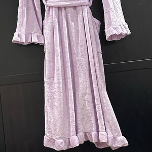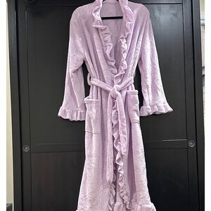 Indulge in comfort with this elegant lavender robe featuring charming ruffle trims. Perfect for lounging or after a bath, this robe offers a soft and cozy feel.