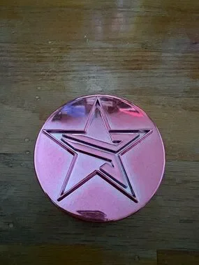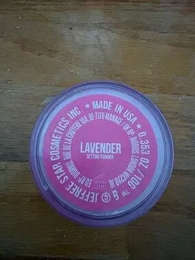 Round compact labeled "Lavender" setting powder. Vivid pink label with purple outer ring. Lightweight, travel-friendly makeup piece.