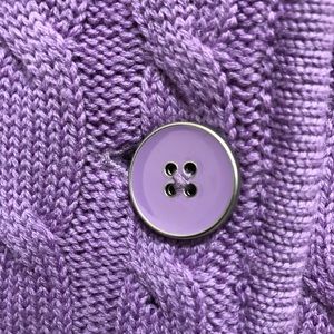 Beautiful long sleeve Merino Wool sweater with lavender buttons and fold down collar.