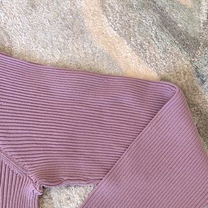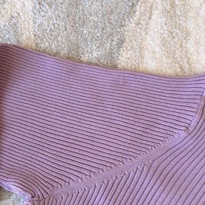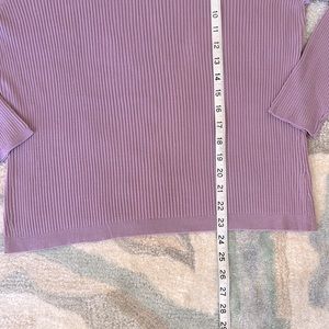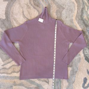 Lightweight, stretchy, vertical rib-knit turtleneck with finished finer knit hem and sleeves.