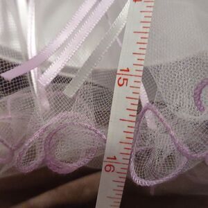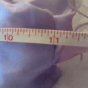 Lavender and white baby girl fancy dress suitable for pageant, wedding or birthday party, satin bodice and skirt covered in layer of netting, satin flower accents with pearl centers (one is missing the seed pearls) along neckline and hemline back has ruffled train button back closure double layer satin tie, sequined and pearl applique along bodice, size says 0 months but the measurements are 15 in from shoulder to hem and 11 in pit to pit, dry clean only, great condition