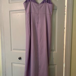 Lavender midi dress with high low detail. Perfect for a wedding, bridal or baby shower