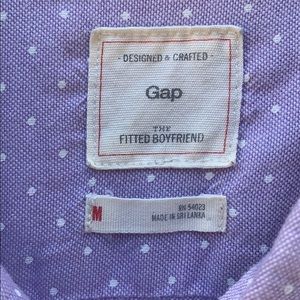 This button up will soon become your favorite go-to. It’s soft and comfortable with a beautiful lavender color. The small white polka dots add a fun twist. Worn twice.