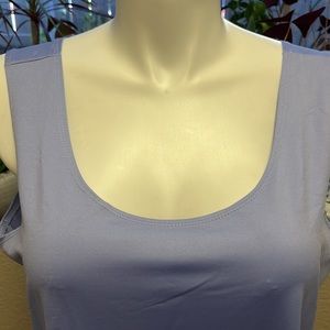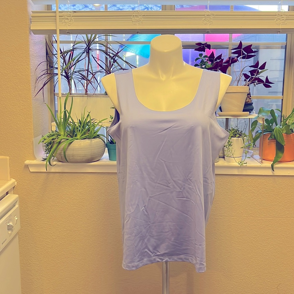 Lavender shell scoopneck tank. 92% nylon 8% spandex. Size 22/24. Looks great under a jacket or a lightweight shirt. It’s only wrinkled because it’s been in a box for a while. Dries straight.