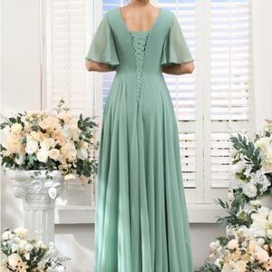 • Style: Flowing chiffon gown with flutter sleeves and a V-neckline.