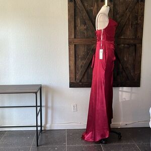 New with tag very pretty dress, The fitted bodice of this silhouette features an asymmetric ruched design exalting the look of the garment. The skirt of the silhouette features a high slit on the front completing this alluring outfit.