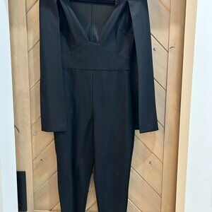 Black jumpsuit from Lavish Alice is a must have for party season. Slight stretch. Fitted at ankle. Shoulder pads for structured silhouette.