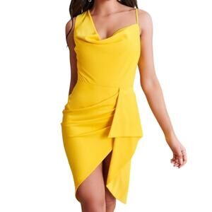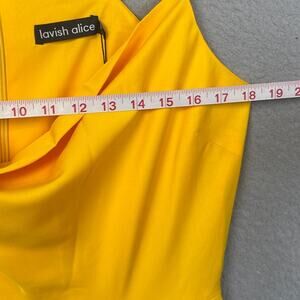 Lavish Alice Emma Cowl Neck Faux Wrap Dress, size 10 NWT. Stunning mustard yellow hue with a draped cowl neckline and sleek faux wrap design—modern designer style perfect for events or nights out.