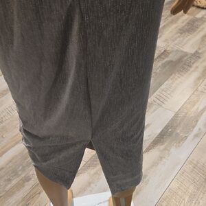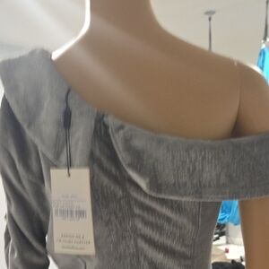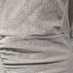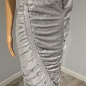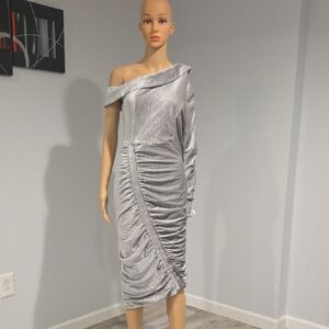 Stunning metallic silver dress with one-shoulder design. Features elegant ruching detail. Ideal for evening events.