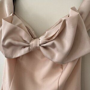 Fitted. Off the shoulder. Knee length. Slit front. Bow center detail.