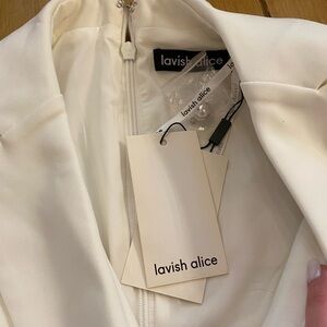 New with tags, size 0 Lavish Alice cut-out detail blazer dress with pearl trim in white. So beautiful and unique! Fully lined, polyester and I have the measurements in the pictures. In excellent condition. Please let me know if you have any questions and thank you for considering my beautiful item.🌷