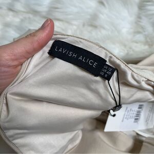 Gorgeous beige peplum style dress by lavish Alice. NWT but the bottom hem has dropped a little and could use reinforcement. Lying flat armpit to armpit approx 15.5” across and top of shoulder to bottom hem approx 34”. All measurements are approximate