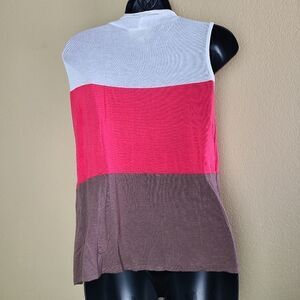 This is a cardigan/tank top combo by Lavish. It is color block brown, pink, and white. The tank is solid white and connected in the shoulder area. Note there is some pilling as shown in the photos.