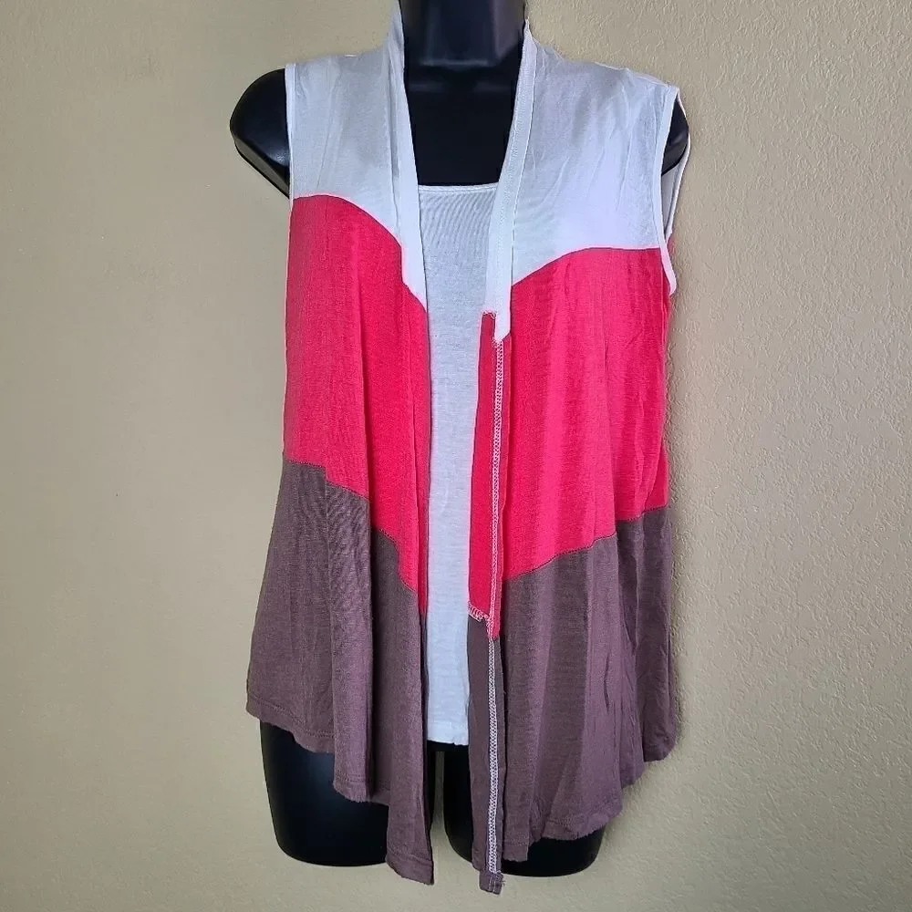 This is a cardigan/tank top combo by Lavish. It is color block brown, pink, and white. The tank is solid white and connected in the shoulder area. Note there is some pilling as shown in the photos.