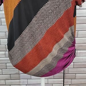 100% polyester soft stretchy fabric in a bold multi-colored diagonal print. Short sleeved, a scooped neckline and ruched on the sides at the hemline creating a cocoon shape. Great pre-owned condition