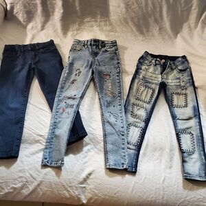 These are gently used Lavo, Cat & Jack and Place Denim Jeans Light Wash and Dark Wash Pants Size 5 Unicorn Rainbow Patchwork Color Block. See images for material tags.