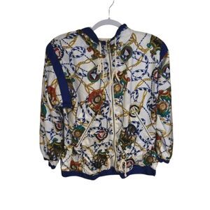Like new condition. White with red blue and gold nautical print. Adjustable waist. Hooded. Zipper side pockets. Ship wheel anchor zipper tab. Shiny windbreaker like fabric. Perfect 4th of July boat night attire!