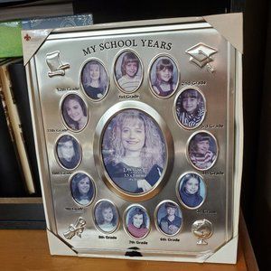 Elegant silver photo frame with multiple openings for school year photos. Features a central oval for a larger picture. Perfect for displaying school memories. Traditional silver metal frame will compliment any décor. Constructed of heavy weight metal and silver-plated; includes high quality black velvet backing. There are 13 openings, 12 smaller openings for grades 1 through 12