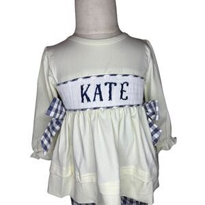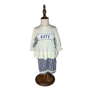This darling Laya & Linc outfit set is perfect for your little sunshine! The vibrant yellow and blue color scheme is sure to brighten up any day. The set includes a top with charming ruffles and adorable bows at the sides, plus sweet gingham pants. Both pieces are smocked with the name “Kate”, adding a special touch. This outfit is brand new and in perfect condition, ready to make your little one the star of the show!