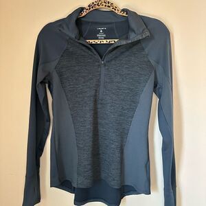 In excellent condition. Basic dark gray long sleeve athletic top. Half zip closure with fold over collar. Has ribbed detail along the sides and sleeves and is super stretchy and comfy! Cuffs have thumb holes. Size small