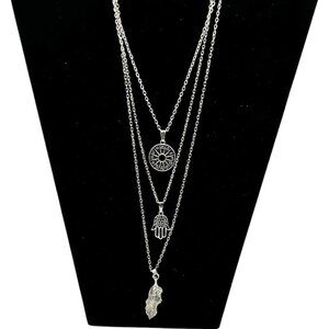 Layered Antique Silver Pendant Necklace With Compass Hamsa Hand & Feather Charms