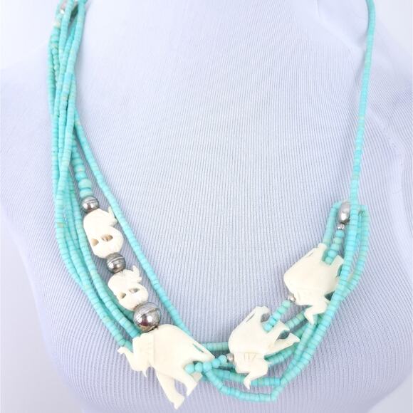 Layered Beaded Necklace Elephant, Blue White/Cream - Animal Theme. Very beachy in color! 15.5 length when folded. Accented with silver toned beads.