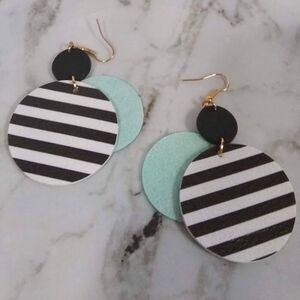 A larger faux leather circle of black & white stripes are the background for a beautiful faux leather aqua disc topped with a solid black wooden disc. The hook & hardware are in gold-tone. The dangle is approximately 3 ins.