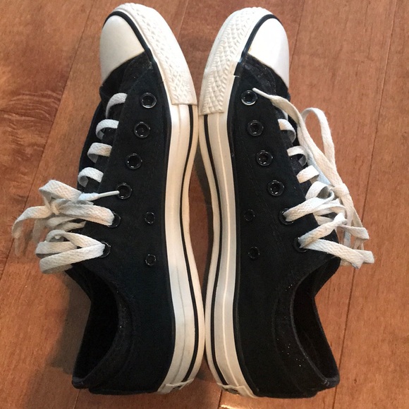 Double layered black converse with the inside layer being a black sparkle. Hardly worn. Minor scuff marks on the white trim. The shoe laces have a lot of lace at the top just because of the way I laced them up the shoe. From a smoke free/pet free home.