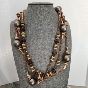 A warm and earthy infinity necklace featuring three continuous strands of natural wood beads, bronze-tone metallic spheres, amber-hued seed beads, and rich cocoa-toned accents. The combination of textures and tones gives this piece an organic, artisan feel with a touch of boho flair.