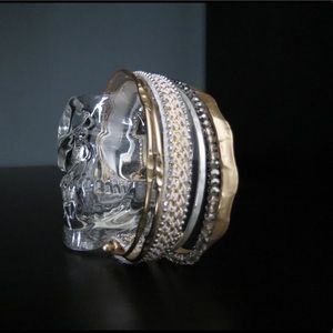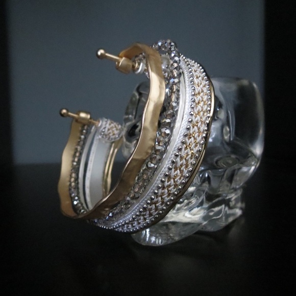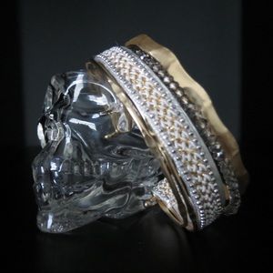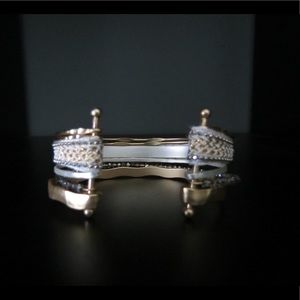 Multiple layers in this gold bangle bracelet offer a wide variety of textures (bead, metal, fabric). Beautiful and versatile piece. Bracelet is about 2 3/4 inch across at its widest point but is adjustable to fit many wrist sizes.