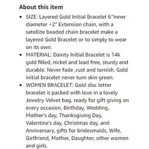 Layered Gold Initial "U" Bracelet, 6" Length with 2”adjustable extension. Fits most women and teen girls. High quality 14k gold plated anti-oxidation and won't get tangled. Sturdy chain with smooth edges, comfortable to wear. No lead, no Nickle, hypoallergenic won't irritate and hurt the skin. Will ship fast and with care!